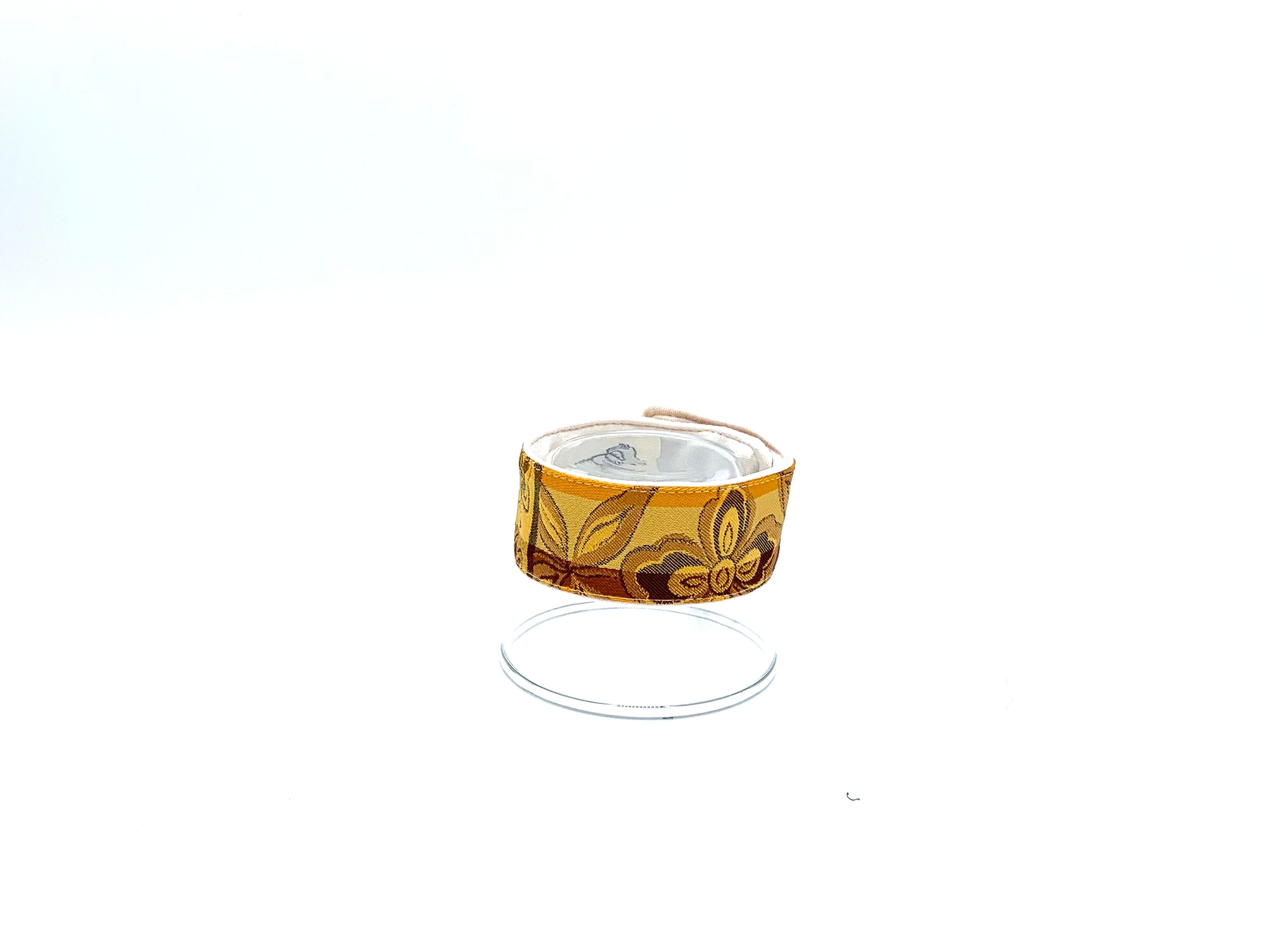 帯の美しい織りと柄を生かしたバングルです。スチールの芯が入っているので、ワンタッチで、くるりと手首や足首に巻き付きます。日常生活の中でも、おしゃれなバングルを身につけると、気分も晴れやかになることでしょう。日本伝統の織物と現代的なスタイルが融合した特別なアクセサリーです。